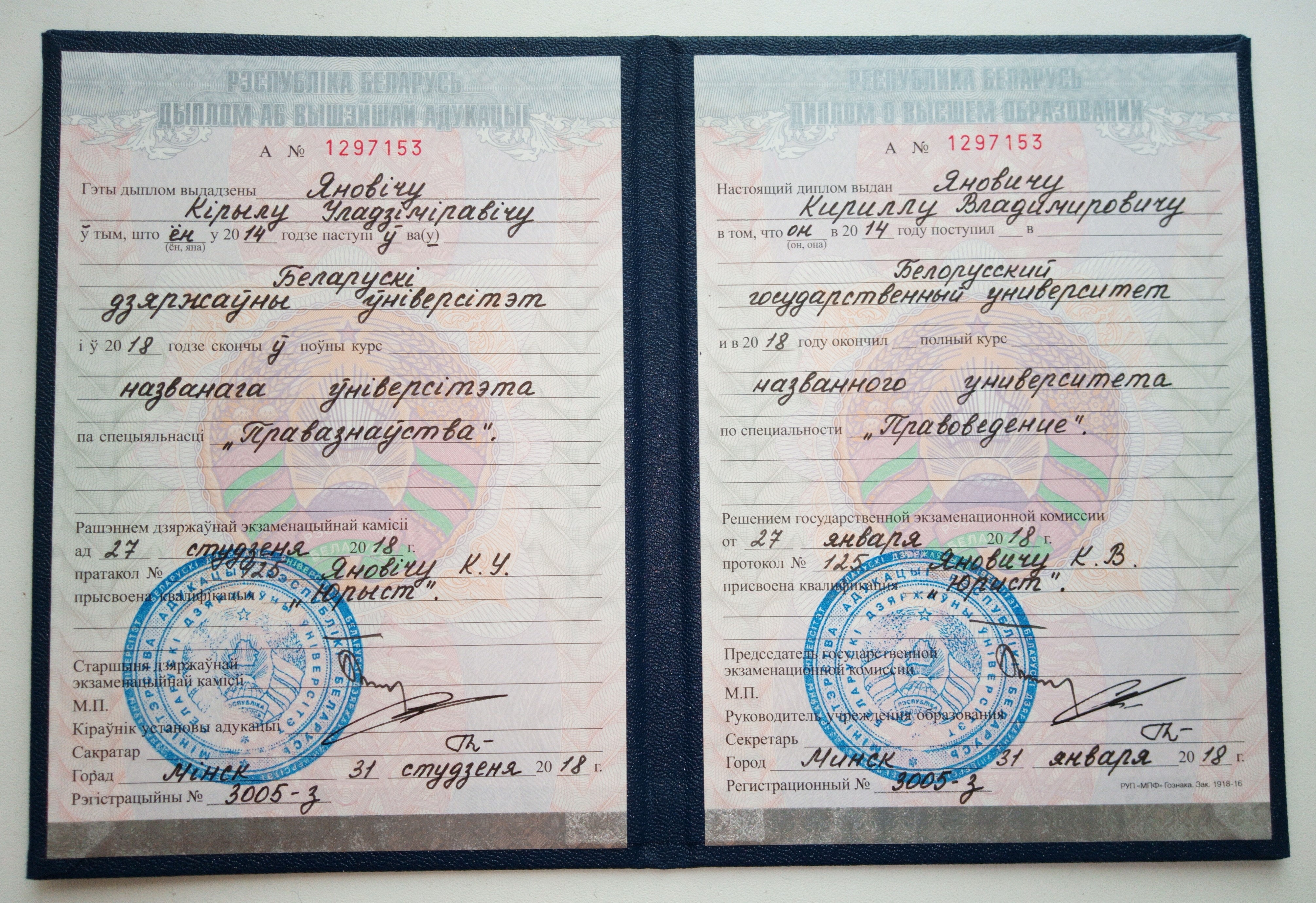 Белорусский государственный университет. Юридический факультет. Специальность Правоведение. Квалификация "Юрист"