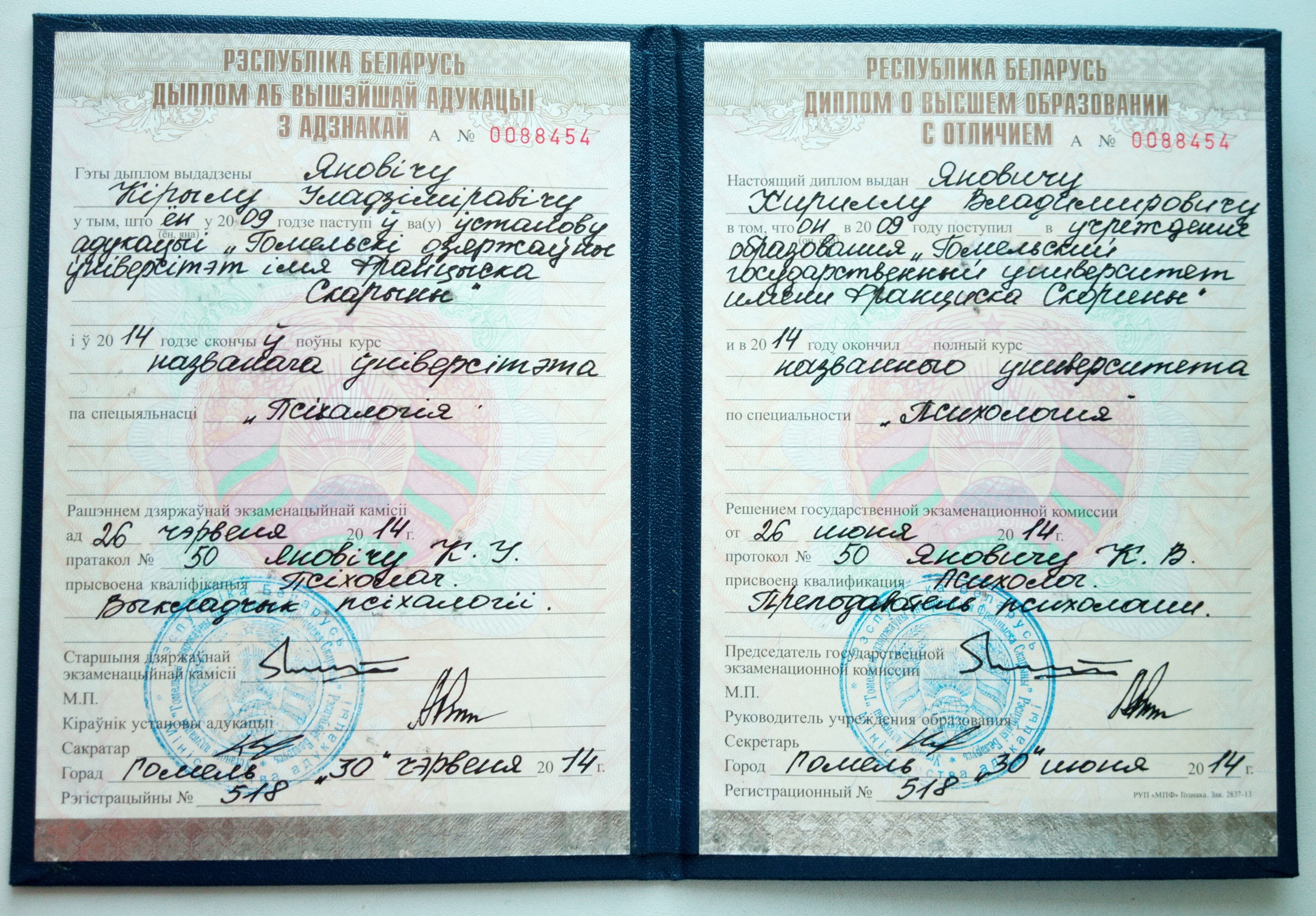Гомельский государственный университет имени Франциска Скорины. Факультет психологии и педагогики. Специальность Психология. Квалификация "Психолог. Преподаватель психологии"