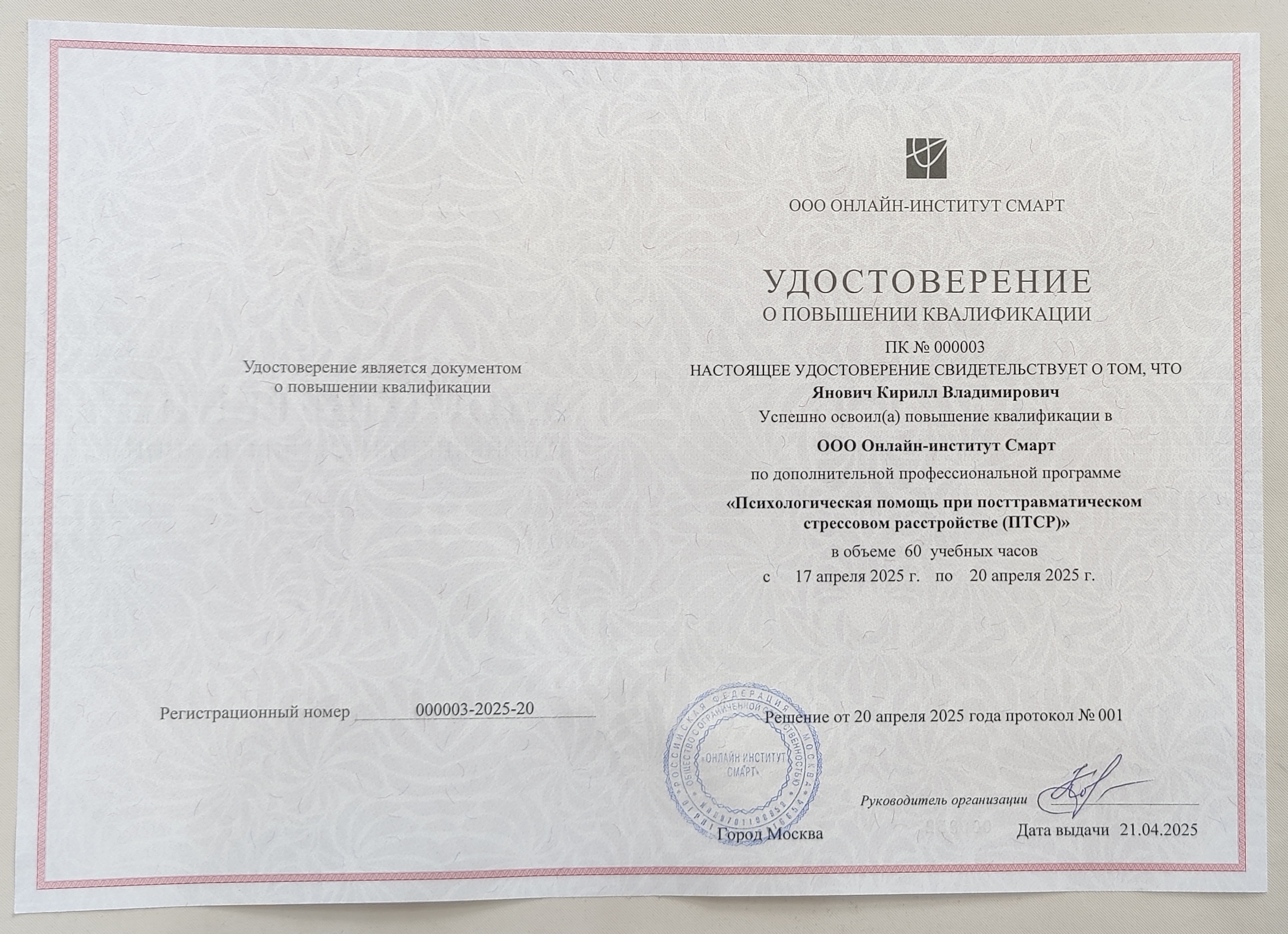 ООО "Онлайн-институт Смарт". Повышение квалификации. "Психологическая помощь при посттравматическом стрессовом расстройстве (ПТСР)"