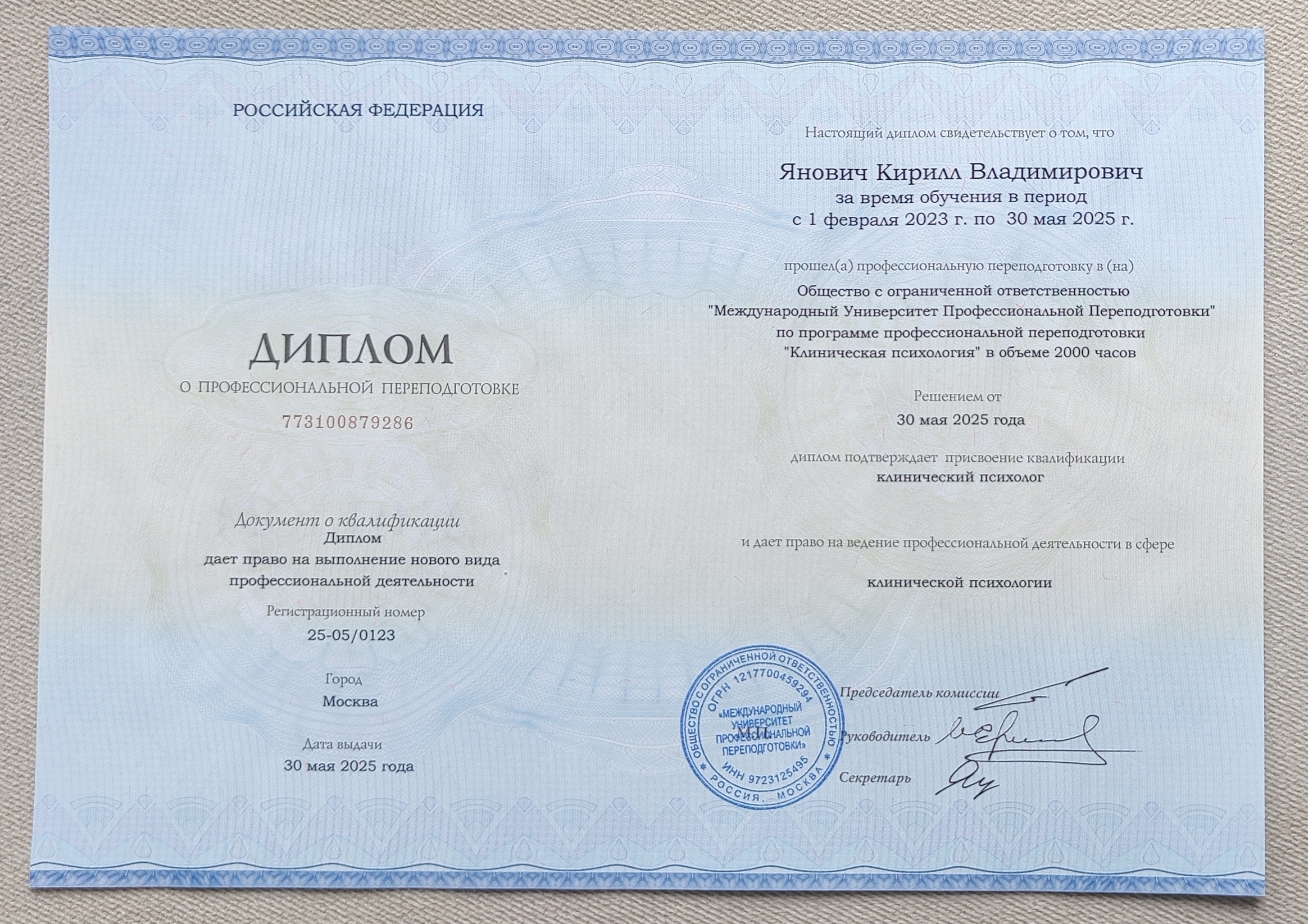 ООО "Международный университет профессиональной подготовки". Профессиональная переподготовка. Квалификация Клинический психолог.